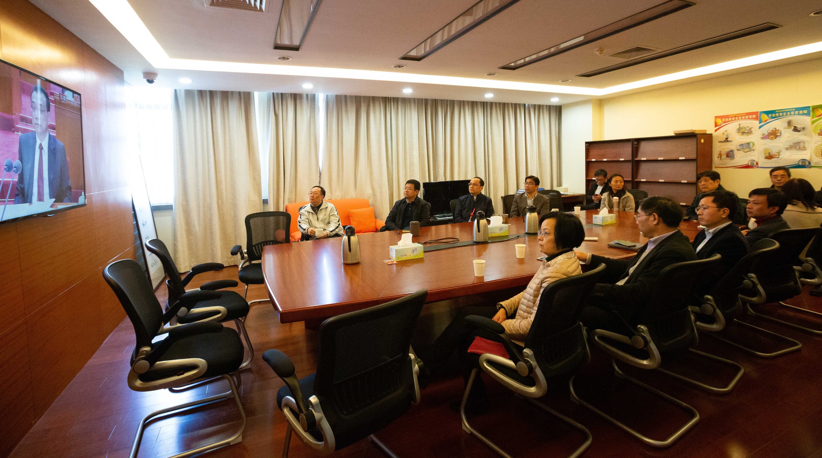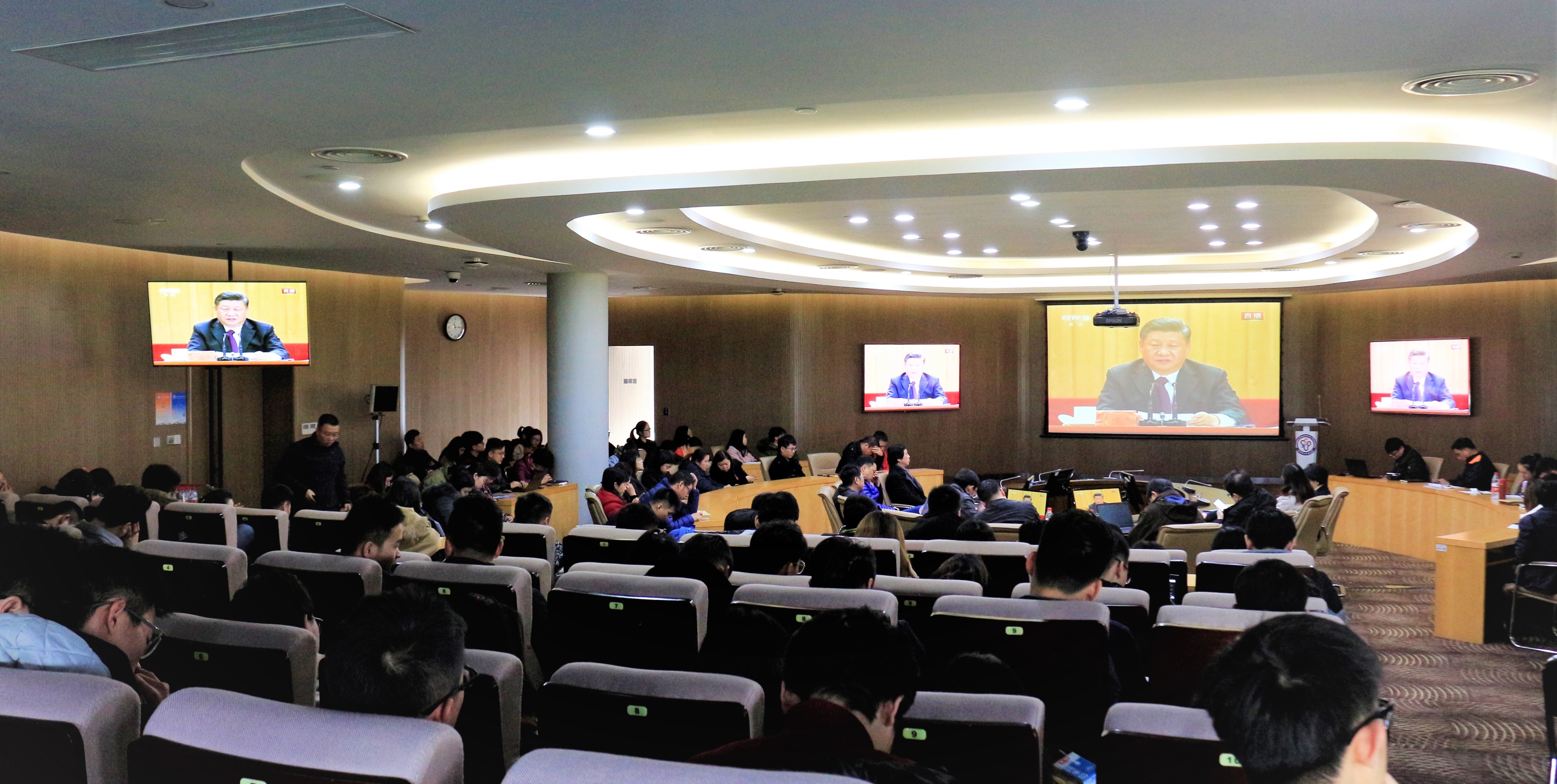在各分會場,二級黨組織、直屬黨支部、三所中專校分別組織黨員干部、黨支部書記、專業負責人、師生代表等在會議室、教研室共同收看直播。師生們在實驗室、寢室等場所通過手機、電腦自發收看,圖書館電子屏前也吸引了來往師生駐足觀看。