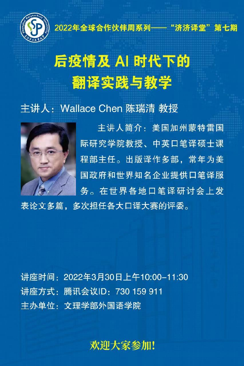 講座簡(jiǎn)介:本講座為2022年全球合作伙伴周系列活動(dòng)之一,介紹后疫情及AI時(shí)代下的翻譯實(shí)踐與教學(xué)。