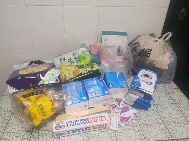 了解受助老師的需求清單后,高鳴立即行動,化身“快遞員”。為減少與外界接觸,他盡量“收集”家里的食品與日用品,家人還熱心提供了保暖衣物,并貼心準備了方便攜帶的袋子。做好防護后,高老師頂著風雨,前往藥房采購額溫槍、降溫貼等常備藥物,1小時內將所有物品集齊“閃送”到了醫院門衛室。