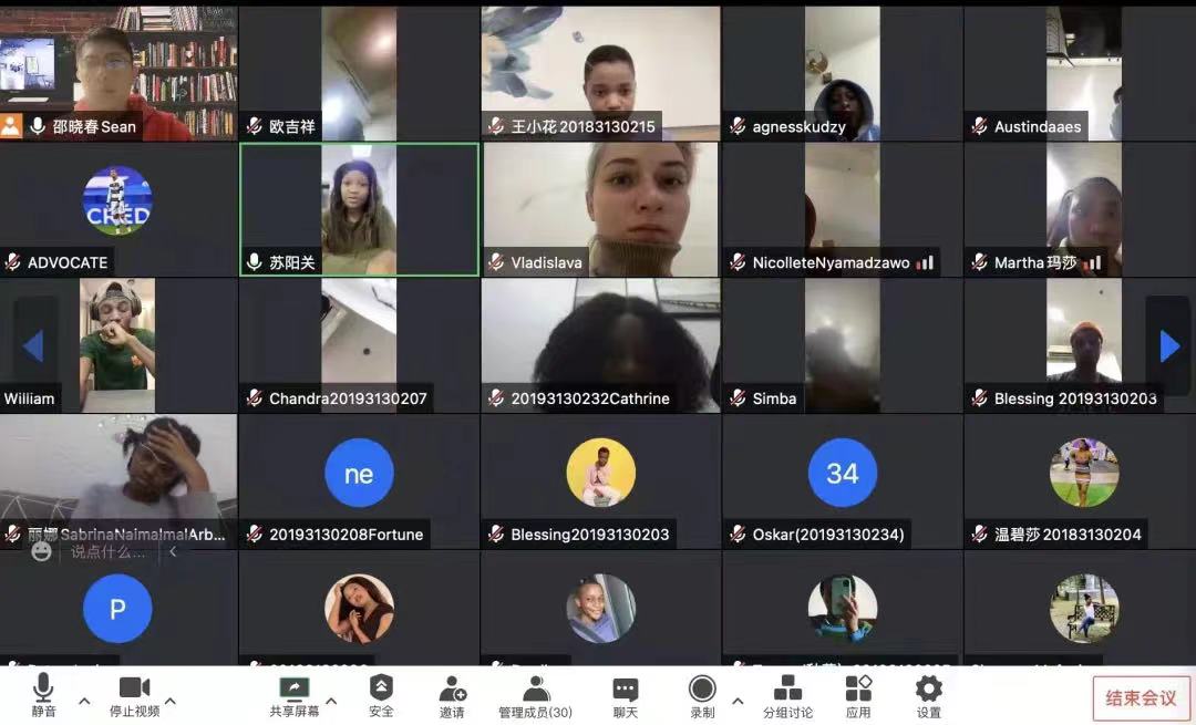 為保障教學效果,學院配合視頻直播、課程錄播、網(wǎng)上平臺、在線答疑、資源分享等多種教學手段,保證了線上教學質(zhì)量,受到學生們的認可和好評。來自津巴布韋的王獅(THOMPSON)同學表示:“為避免疫情傳播,學校采取在線學習的方式。我通過騰訊會議聯(lián)系我的論文導師,有問題時會發(fā)信息約定時間進行討論,一切都很順利。”