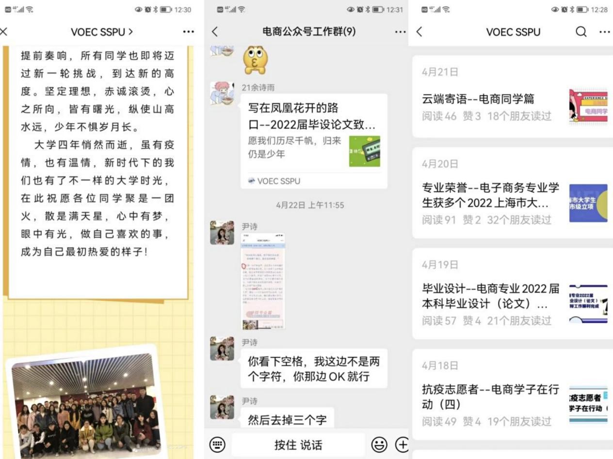 疫情防控期間,為做好專業(yè)內(nèi)容與教師、輔導(dǎo)員、班級(jí)、學(xué)生的及時(shí)互動(dòng),提高專業(yè)成員的集體榮譽(yù)感,增強(qiáng)專業(yè)凝聚力,電子商務(wù)專業(yè)建立專業(yè)思政線上服務(wù)平臺(tái),發(fā)布學(xué)生黨員及入黨積極分子行為準(zhǔn)則,并于3月27日創(chuàng)建公眾號(hào)“VOEC SSPU”,全稱為“Voice of E-Commerce”,向?qū)W生征集而來,寓意電商之聲。公眾號(hào)目前已發(fā)布推文30余篇,涵蓋專業(yè)教學(xué)、學(xué)生活動(dòng)、專業(yè)榮譽(yù)等九大模塊。針對(duì)疫情,發(fā)布“云端寄語”系列推文,分為輔導(dǎo)員篇、教師篇、校友篇、班長(zhǎng)篇、班委篇和同學(xué)篇;同時(shí)推出了師生抗疫志愿者系列訪談。針對(duì)教學(xué)和班團(tuán)活動(dòng),發(fā)布畢業(yè)論文優(yōu)秀致謝辭、線上班會(huì)等活動(dòng)展示。教師和學(xué)生志愿者們建立了公眾號(hào)的信息收集組、推文制作組和文字及設(shè)計(jì)審核組,動(dòng)員專業(yè)內(nèi)學(xué)生黨員和入黨積極分子參與建設(shè),及時(shí)跟進(jìn)教學(xué)和班級(jí)師生動(dòng)態(tài),為電子商務(wù)專業(yè)的專業(yè)思政工作起到了橋梁與紐帶的作用。