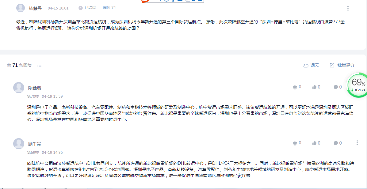 針對(duì)《運(yùn)輸管理》課程的特點(diǎn),林慧丹老師采取“課前知識(shí)點(diǎn)在線視頻預(yù)習(xí)+課中在線簽到、選人搶答、主題討論+課堂后隨堂作業(yè)布置”三位一體的“線上混合式翻轉(zhuǎn)課堂”教學(xué)形式,并精心設(shè)計(jì)了各種熱點(diǎn)話題供學(xué)生討論,如俄羅斯烏克蘭戰(zhàn)爭(zhēng)對(duì)全球供應(yīng)鏈有什么影響、俄軍為什么會(huì)選擇敖德薩港登陸、歐陸深圳機(jī)場(chǎng)新開“深圳-德里-萊比錫”貨運(yùn)航線動(dòng)因分析等。此外,林慧丹老師在授課過程中積極融入了課程思政元素,基于航運(yùn)物流貨代企業(yè)抗疫現(xiàn)金禮包福利案例,討論疫情下物流企業(yè)的人文關(guān)懷,提供了上海抗疫背景下大量物流企業(yè)的正能量案例,培養(yǎng)了學(xué)生作為未來物流人的職業(yè)擔(dān)當(dāng)意識(shí)。