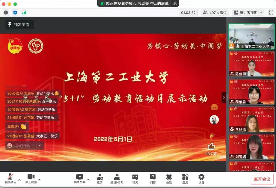 5月1日上午,以“勞模心?勞動美?中國夢”為主題的第三屆勞動教育活動月展示活動在線上舉行。副校長丁力,組織部、宣傳部、學工部、教務處、馬克思主義學院、校團委等相關部門負責人,各學部(院)學生工作負責人、分團委書記以及各園區學生樓長、師生代表參加了本次展示活動。