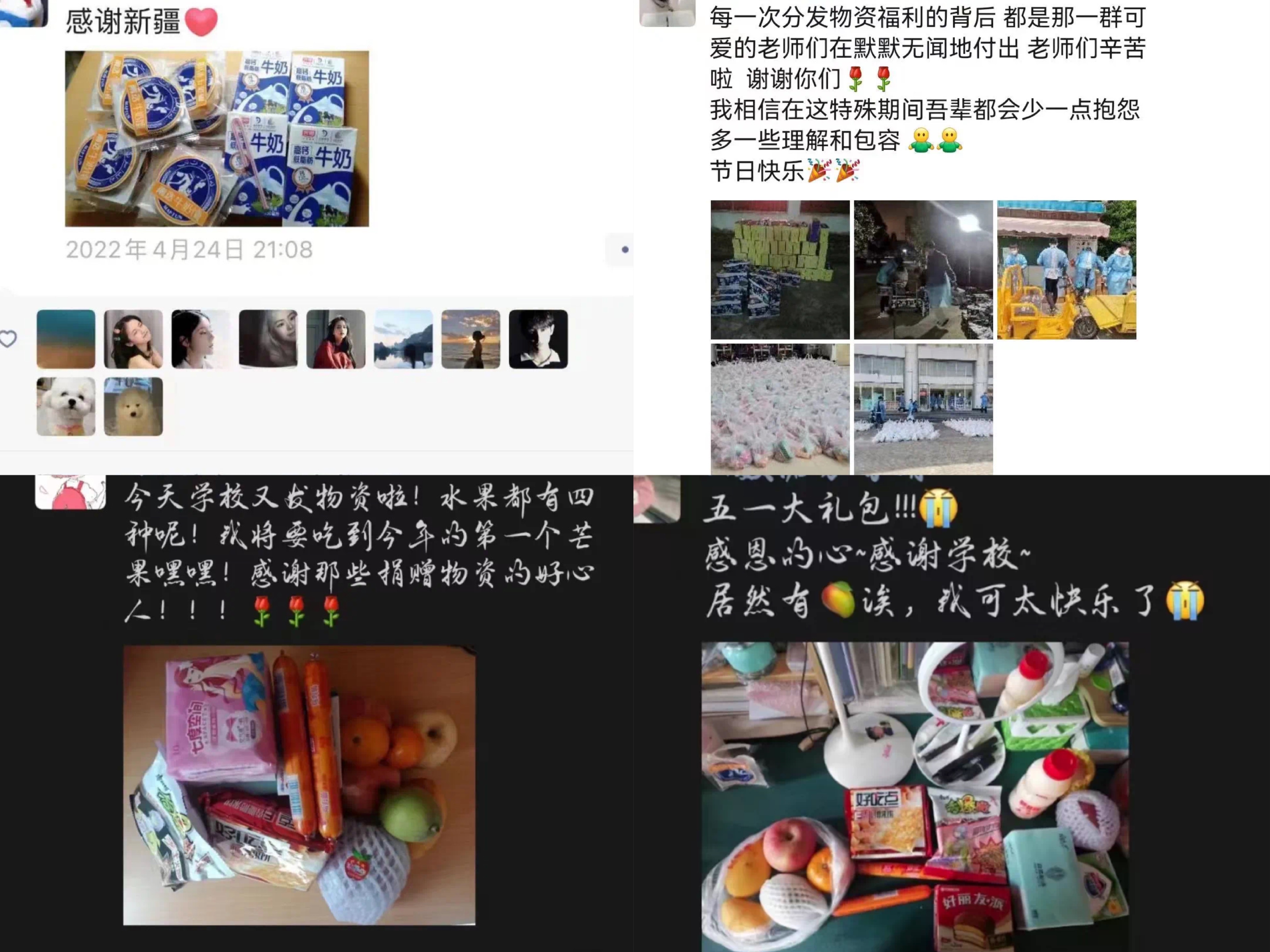 來自捐贈單位和愛心人士的“投喂”與關懷,精準送達同學們的手中。5月1日,在校的50多名教職工志愿者,多部門協同作戰,用時5個多小時,為學生裝配4000份捐贈物資大禮包,“花式寵愛”在校學生,開展暖心服務。拿到一批又一批愛心物資,同學們收獲的不止感動,還有力量。“感謝那些捐贈物資的好心人!”“發自內心的溫暖!”感恩的話語,道不盡心中的感動與感激!