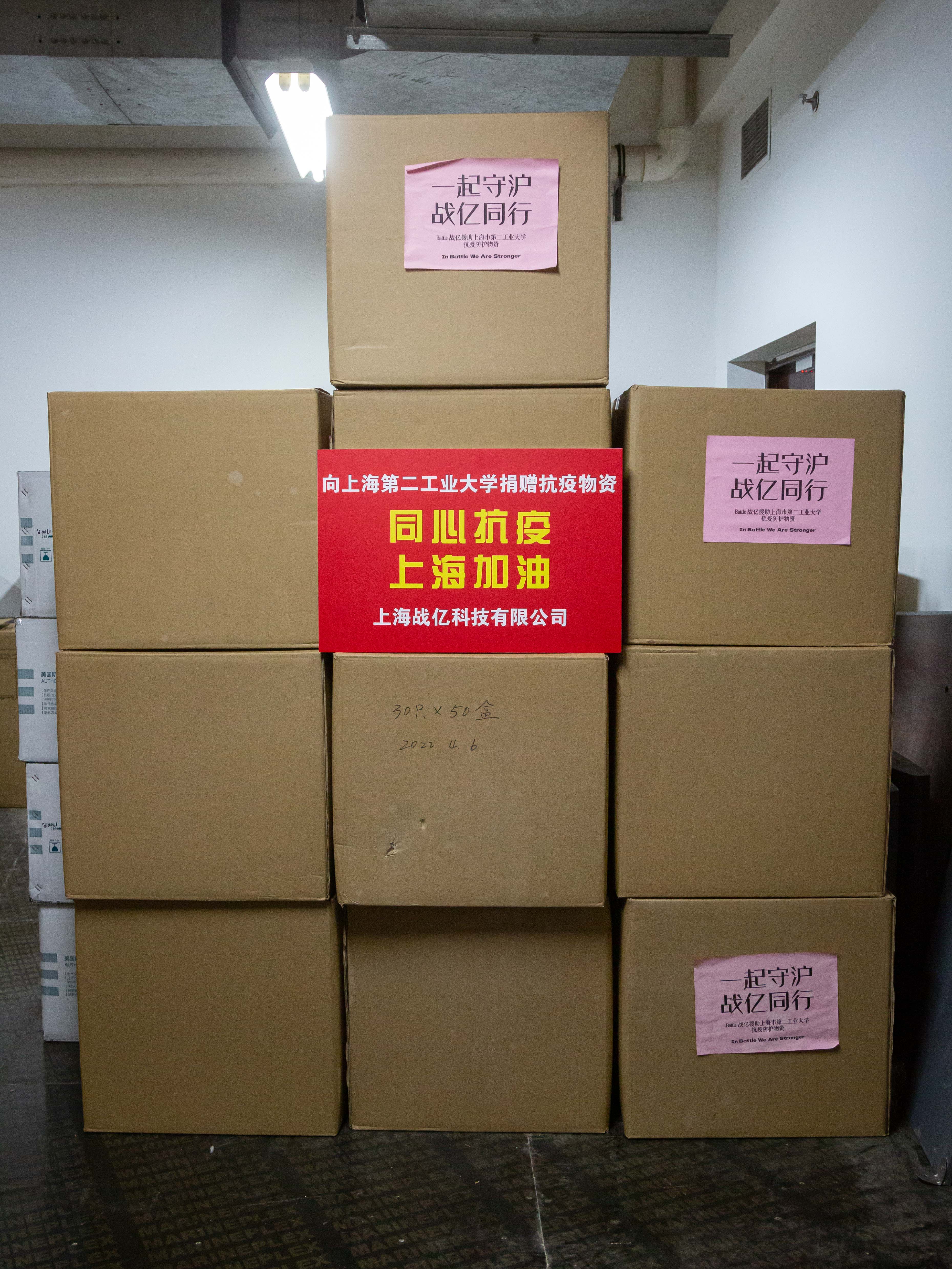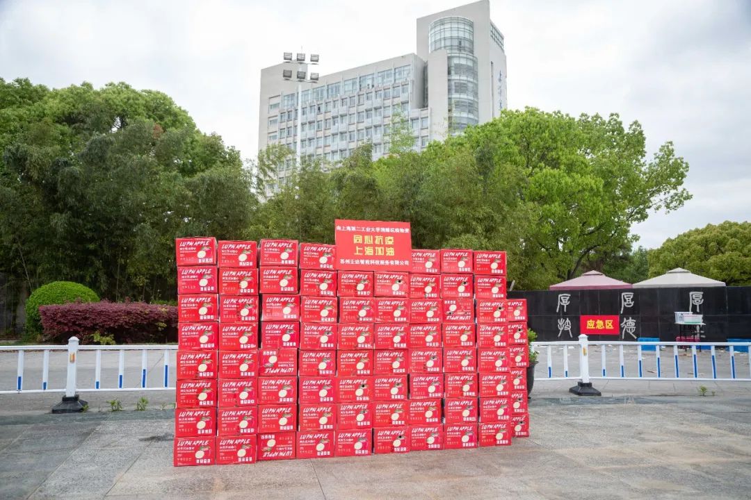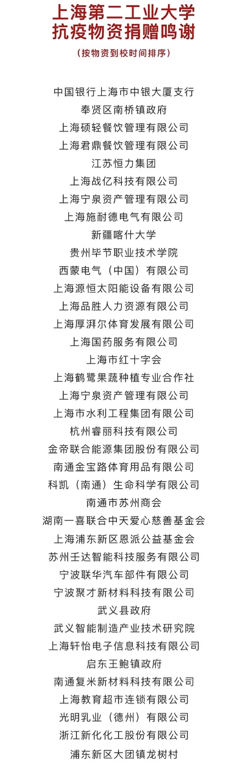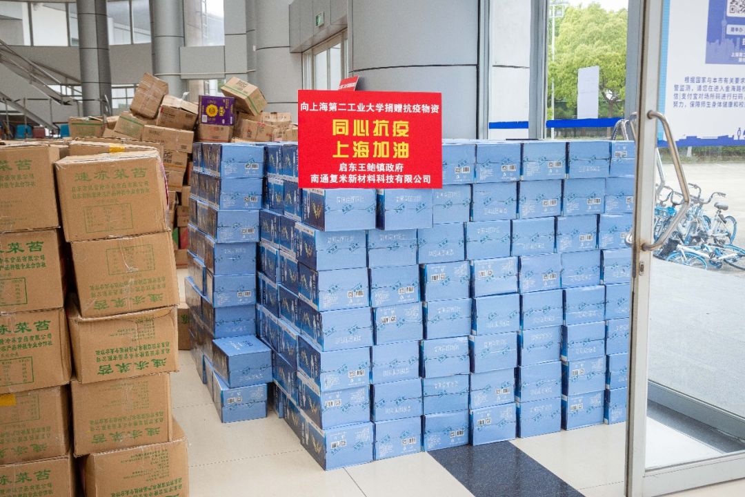 愛心企業,勇擔社會責任。江蘇恒力集團、上海戰億科技有限公司、西蒙電氣(中國)有限公司等20余家企業,迅速啟動馳援模式,確定捐贈物資、落實貨源和物流,克服運力緊張等困難,捐贈N95口罩、戰億金屬離子口罩、防護服、隔離衣、新冠抗原檢測試劑、醫用隔離面罩、醫用檢查手套、免洗消毒凝膠、消毒液等防疫物品,胡蘿卜、萵筍、蘋果、玉瓜等果蔬,以及方便面、飲用水等生活物資,為我校送來愛心與溫暖。