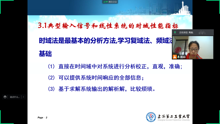 自動化專業的黃淼老師以騰訊會議為平臺,為20級自動化專業本科生線上講授《自動控制原理》課程。為保證學習效果,她為學生提供教師自錄的教學視頻和超星學習通上的其他課程資料,還建立微信班級群。在教學策略上,課前要求學生在學習通簽到;在直播授課過程中實時關注學生狀態,通過提問引導學生思考,采用投票等方式收集學生意見,當意見出現分歧時,讓學生自由開麥討論,引導學生自主探索得出正確答案;采用課堂小測形式,加深學生對授課內容的印象,及時解決學生對時域性能指標定義的理解偏差,從而高效地完成教學任務,達成教學目標;課后,布置緊扣教學目標的線上課后作業,及時檢測學生的學習效果。經過前期的線上教學實踐,黃淼老師總結了提高線上教學質量的一些心得:要求課前預習,并考核預習效果;根據直播授課特點更新教學組織形式和教學內容的調整;師生都要正視在線教學帶來的挑戰,并積極尋求解決辦法。