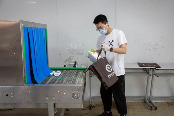 澎湃新聞記者從上海第二工業大學了解到,這臺222nm深紫外快速消毒輸送機,由學校成功自主設計建成,可為進校的快遞包裹、箱包、文件等物品進行全方位消毒。