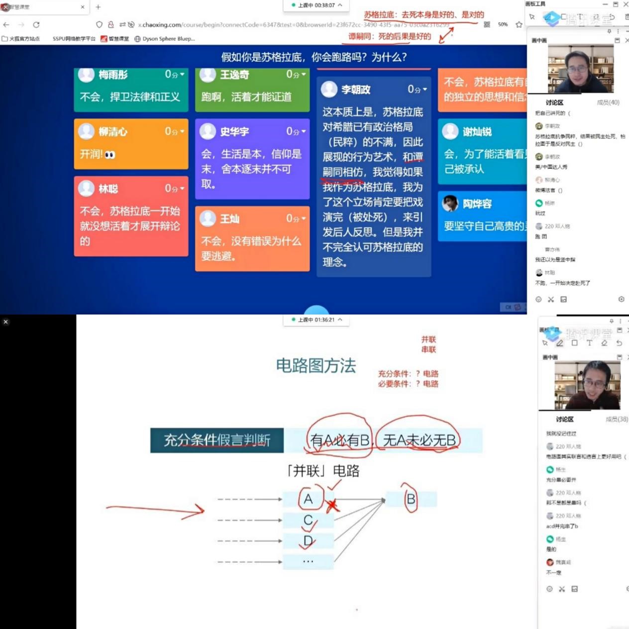 《哲學(xué)思辨》是一門面向非哲學(xué)專業(yè)學(xué)生開設(shè)的通識課程,從西方哲學(xué)傳統(tǒng)中選取與現(xiàn)代生活密切關(guān)聯(lián)的一系列問題,通過反思、對話與閱讀,幫助學(xué)生提升邏輯思考能力,塑造科學(xué)的世界觀、理性的價值觀。姜濤老師在選用“騰訊課堂”平臺直播上課的同時,還使用“學(xué)習(xí)通”平臺進(jìn)行在線投屏互動。他利用學(xué)習(xí)通豐富的內(nèi)置功能,組織投票、評分、隨堂討論等課堂活動,參與活動可以獲得課堂積分,作為期末評分的一部分,充分調(diào)動學(xué)生參與的積極性。考慮到有些同學(xué)怯于“開麥”發(fā)言,姜老師經(jīng)常通過在線文字交流的形式組織討論,新穎的討論形式和有趣的討論題吸引了同學(xué)們的注意力,提升了參與課堂討論的積極性,提升了學(xué)習(xí)效果。