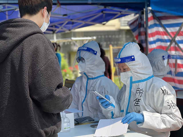 4月21日那天,我認(rèn)領(lǐng)到的是掃樓任務(wù),就是要到封控樓棟開(kāi)展居民核酸檢測(cè)工作。掃樓的整體工作量要比檢測(cè)點(diǎn)位要輕松一些,但是風(fēng)險(xiǎn)性相對(duì)要高一點(diǎn),居委小蔡問(wèn):“你怕不怕?” “怕我就不來(lái)了!”說(shuō)話間,我們倆背著試管、棉簽、居民名冊(cè)、消毒液以及一大瓶5L裝的消毒水來(lái)到16號(hào)樓下,配合社區(qū)衛(wèi)生院的醫(yī)生開(kāi)始采樣。約兩個(gè)小時(shí)左右,我們一共完成兩棟封控樓共計(jì)150人的核酸采樣工作。