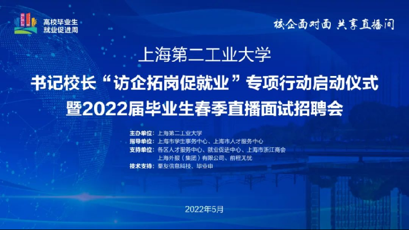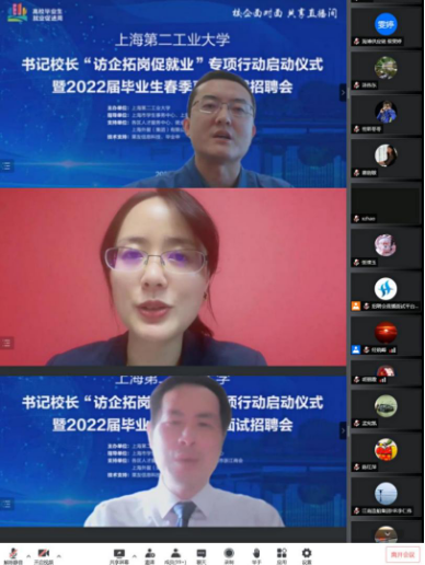 為促進2022屆畢業生順利就業,暢通校企溝通渠道,5月12日,上海第二工業大學書記校長“訪企拓崗促就業”專項行動啟動儀式暨“校企面對面 共享直播間”2022屆畢業生春季直播面試招聘會舉行。啟動儀式由副校長丁力主持,校黨委書記吳松、校長謝華清出席活動并積極向企業推薦上海第二工業大學畢業生。