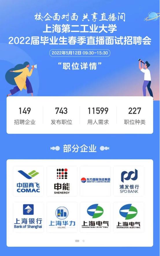 隨后6小時,149家招聘企業齊聚云端直播面試間,與上海第二工業大學畢業生進行線上一對一洽談,共發布崗位需求11599個,崗位供需比27:1。截止到5月12日15:00,學生參與人數累計1496人,累計投遞簡歷3508份,直播間觀看量達1976人次。