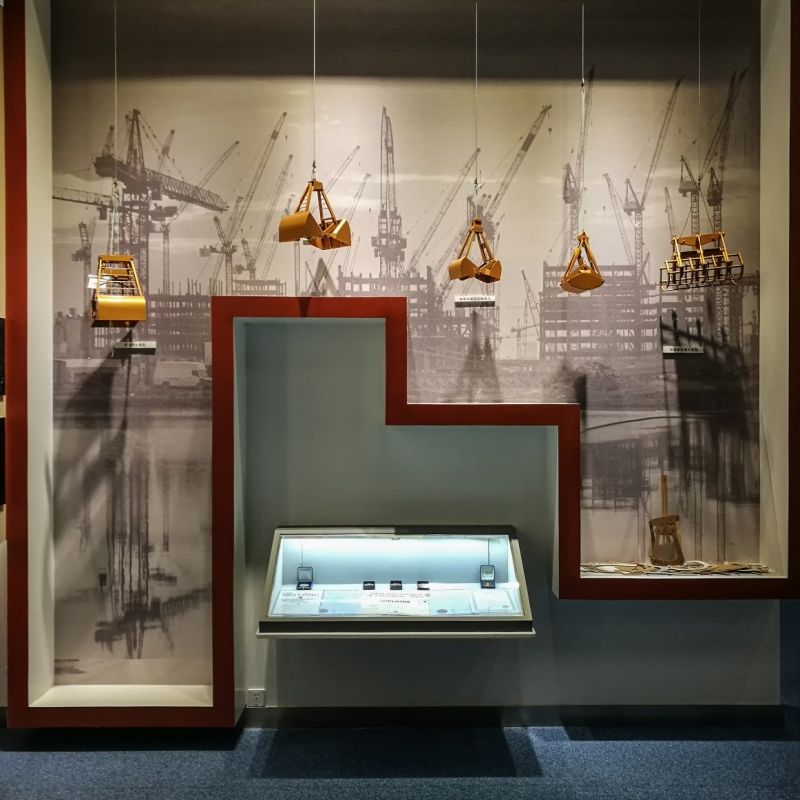 在展示館的門外,一座由上海起帆科技有限公司捐贈的單索木材抓斗赫然醒目,該抓斗由包起帆在上世紀八十年代初發明。在港口裝卸完全依賴人力的上世紀80年代,包起帆率先設計了可變夾抱面積的抓斗齒形曲線,發明了在任意作業面上都能自動啟閉的單索木材抓斗,用抓斗取代人力作業。木材抓斗的發明不僅為當時的碼頭貨物搬運工作帶來了便利,極大地提高了生產效率,還降低了人員傷亡,保障了工人的生命安全。
