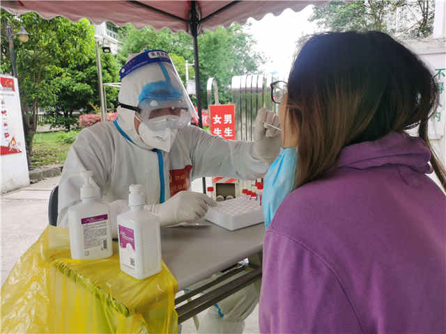 根據工作安排,從4月23日至今,我轉換了“考場”,重返校園。經過隔離期,我認真學習核酸檢測的各項工作要領,不斷練習并經培訓考核后,成為了一個直接從事核酸采樣工作的“教師大白”。從28日起,我每天與同事們一起為學校師生做核酸采樣。