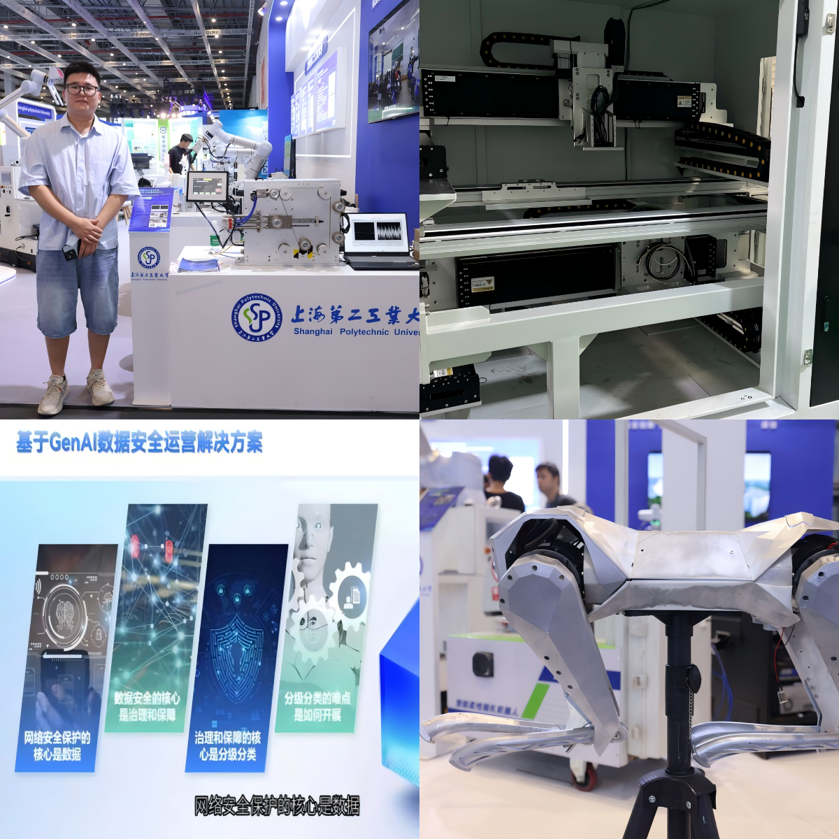 在信息技術領域,張東劍博士團隊自主研發的非接觸式張力在線檢測系統,實現了對繞線張力的實時、在線、無損檢測,有效避免了產品損傷,顯著提升了檢測精度與效率。吳青娥教授團隊研發的高精度直線電機的運動平臺創新采用直線電機直驅方式和高精度的光柵尺,提高了整個運動控制平臺的基礎性能,為半導體、光學、科研提供了高性價比的數字化且穿透到底層的方案。另一參展項目基于GenAI數據安全運營&網絡攻防訓練解決方案已在寧波職業技術大學落地。王真星副教授團隊研發的情緒交互具身智能機器狗,致力于打造全球首款真正具備情感理解與自主決策能力的四足機器人。