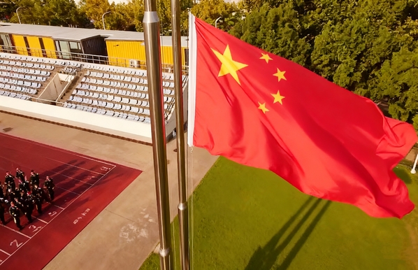 高歌以寄赤子情,追光逐夢啟新程。《我和我的祖國》歌聲響起,伴隨歌聲,現場同學們托舉五星紅旗穿越方陣,同學們通力合作、默契配合,同時展開“勤奮、自強、求實、創新”的校風標語,與巨幅國旗交相輝映,成為現場最動人的風景。