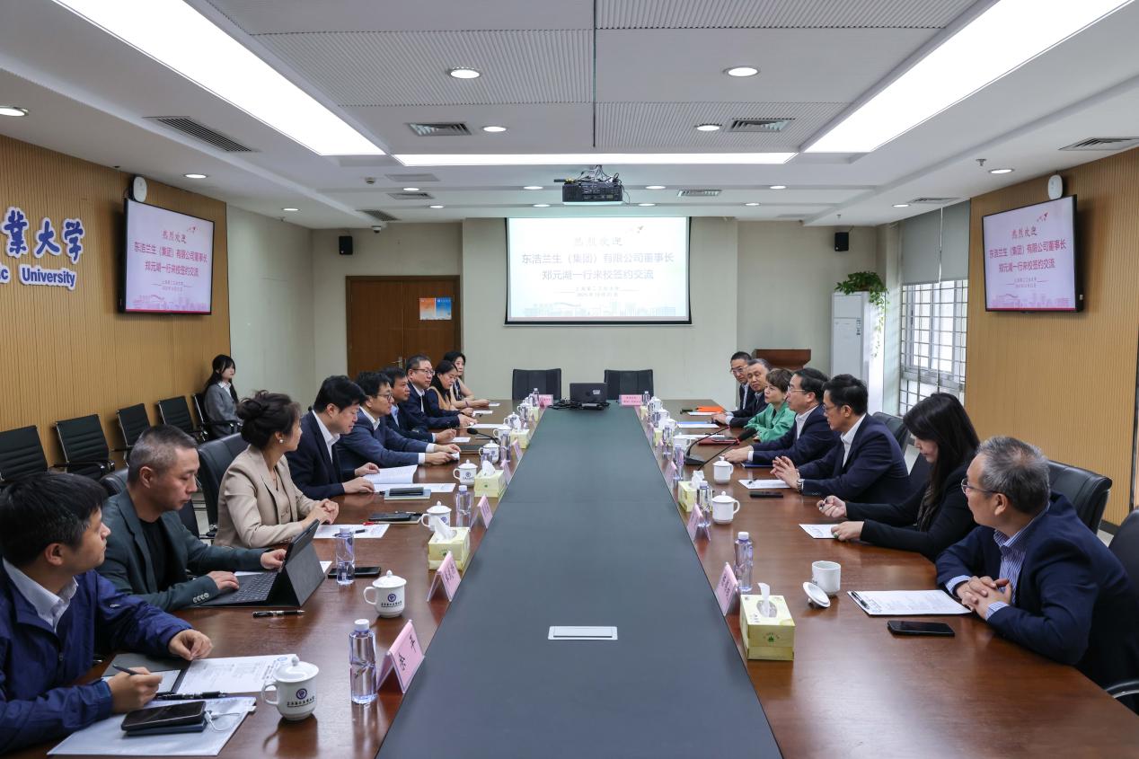 10月21日上午,東浩蘭生(集團)有限公司黨委書記、董事長鄭元湖,黨委副書記、總裁李棟,黨委委員、副總裁周瑾等一行來校考察座談并出席戰略合作簽約儀式。校黨委書記陸敏、校長謝華清、副校長丁彬等接待了鄭元湖一行。